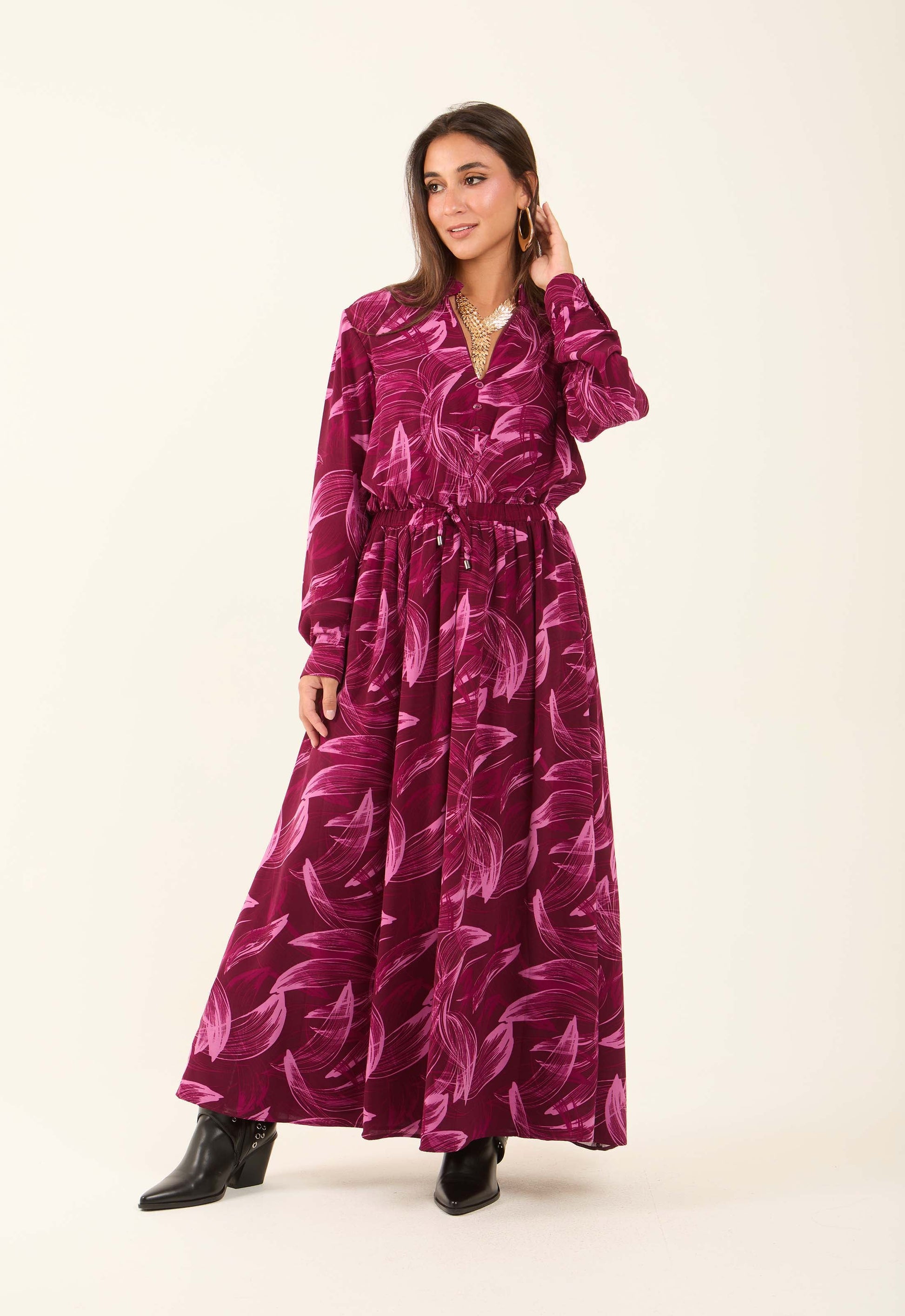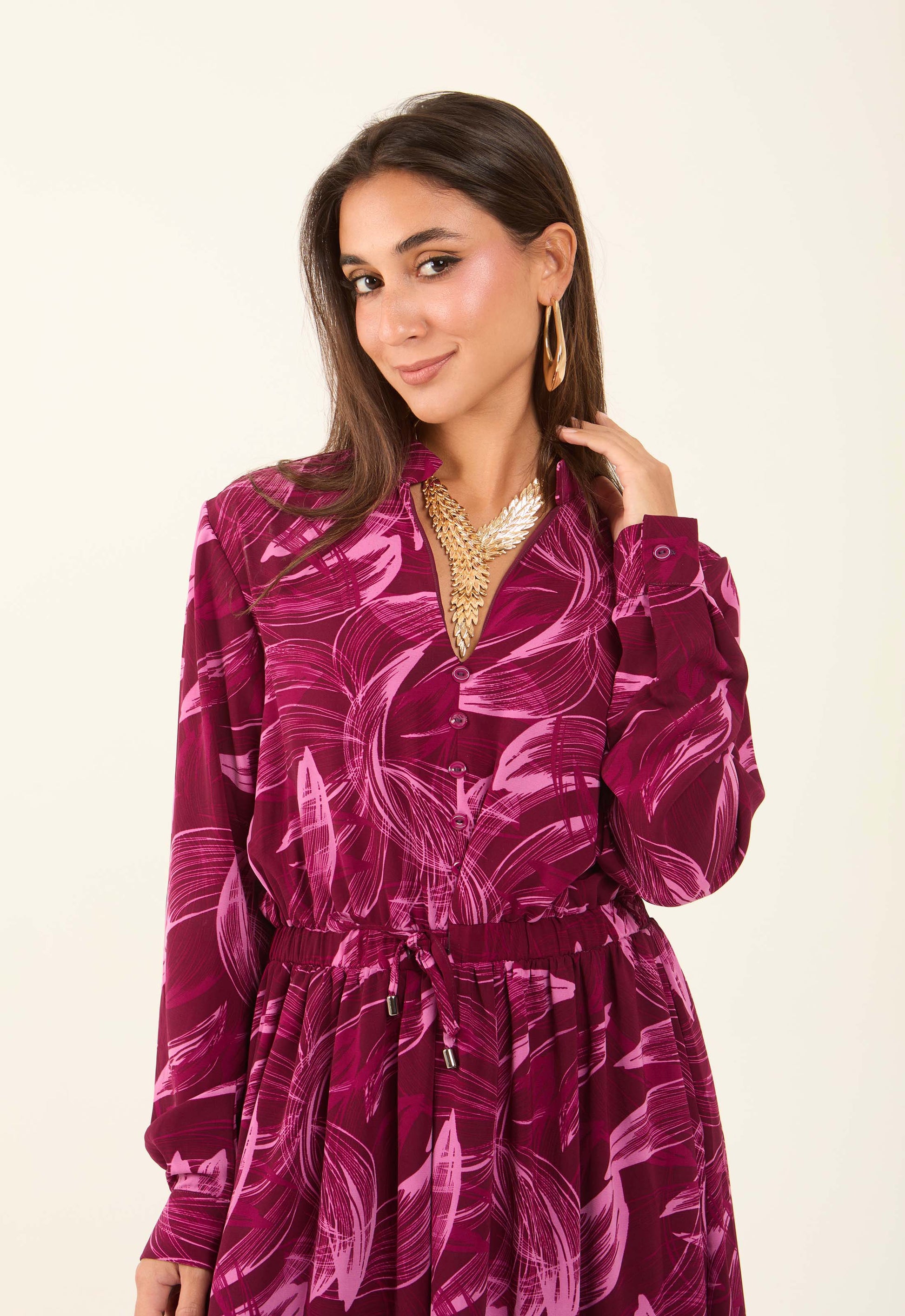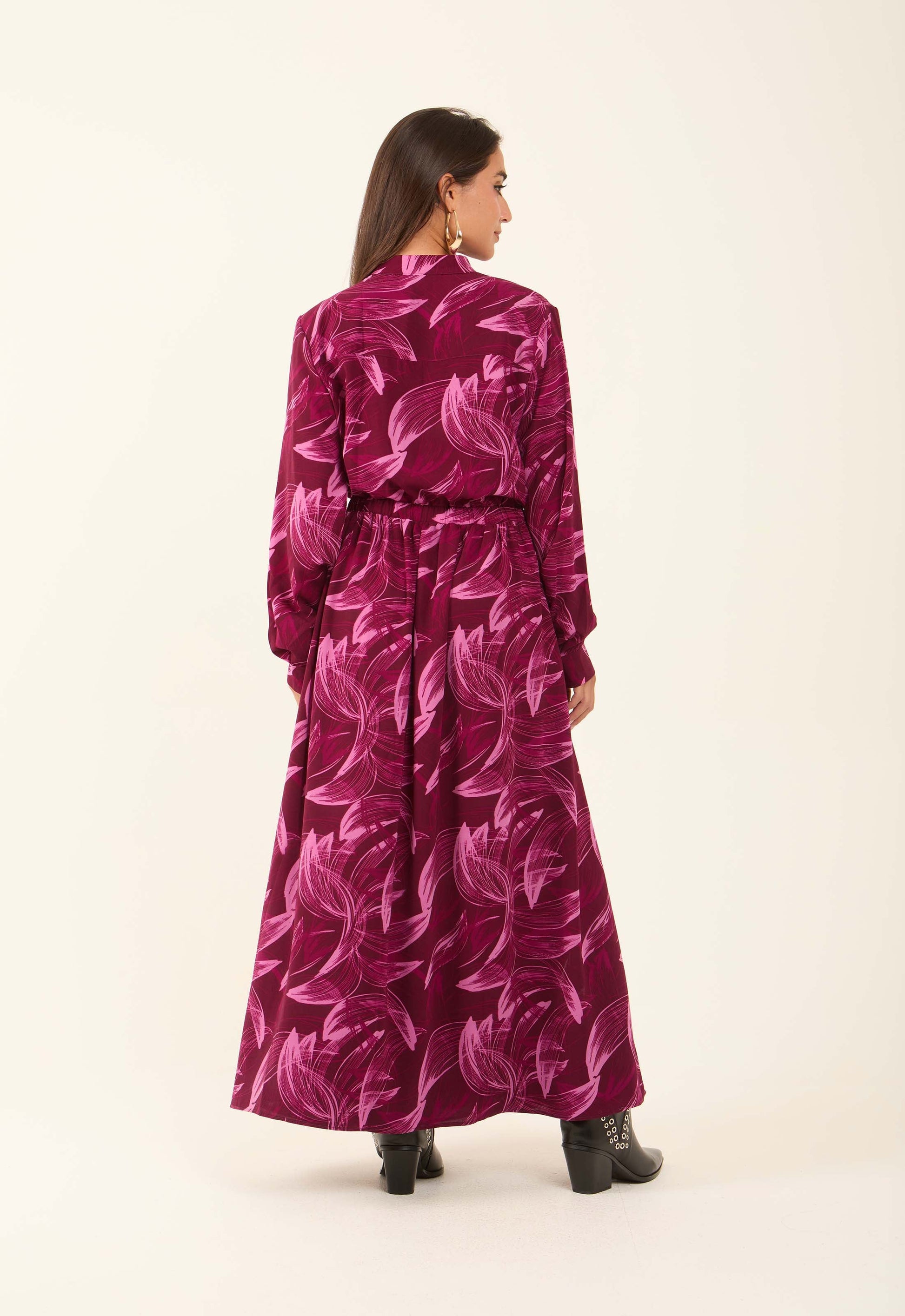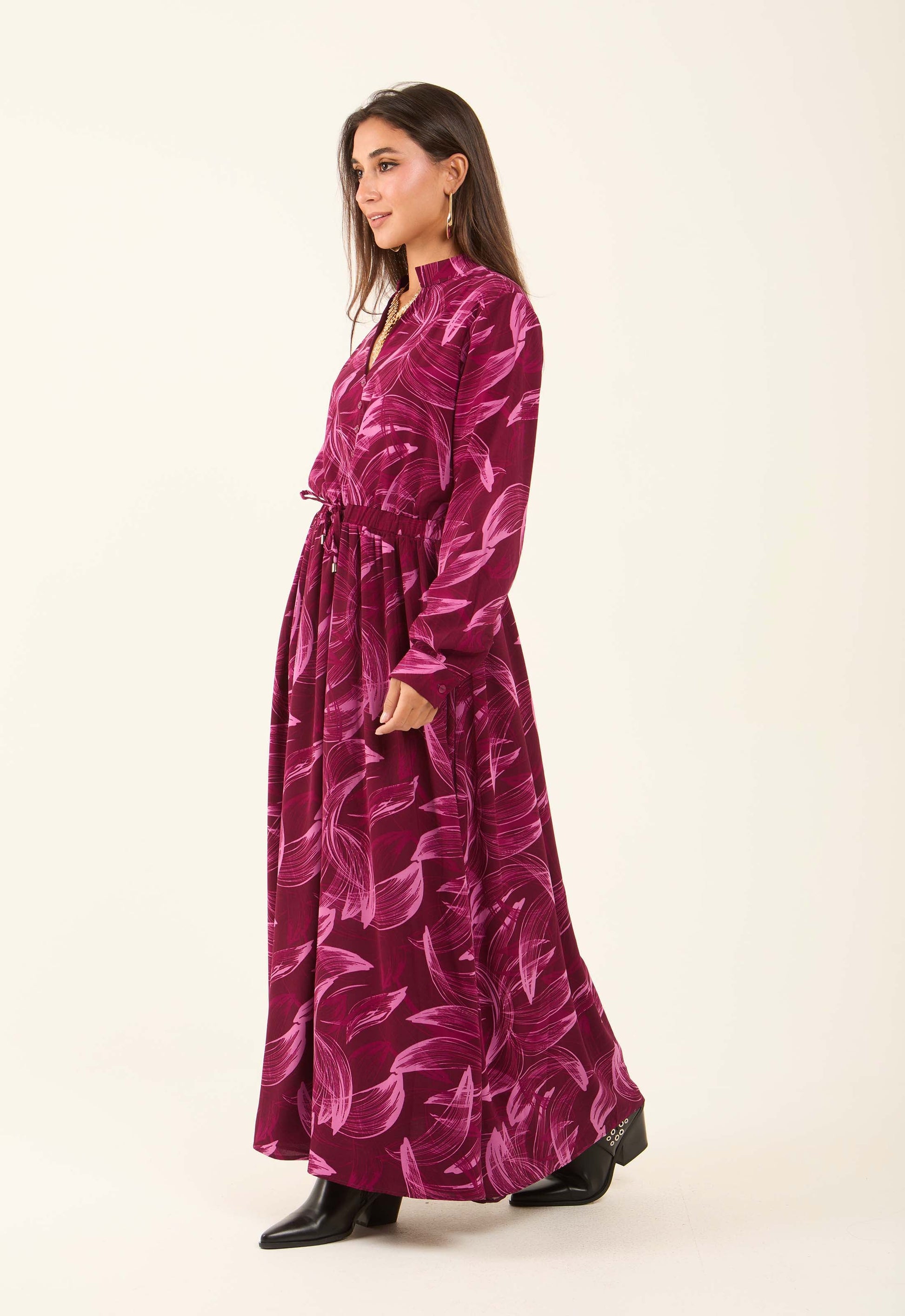 فستان واسع بنقشة أوراق ورقبة V مع رباط للوسط