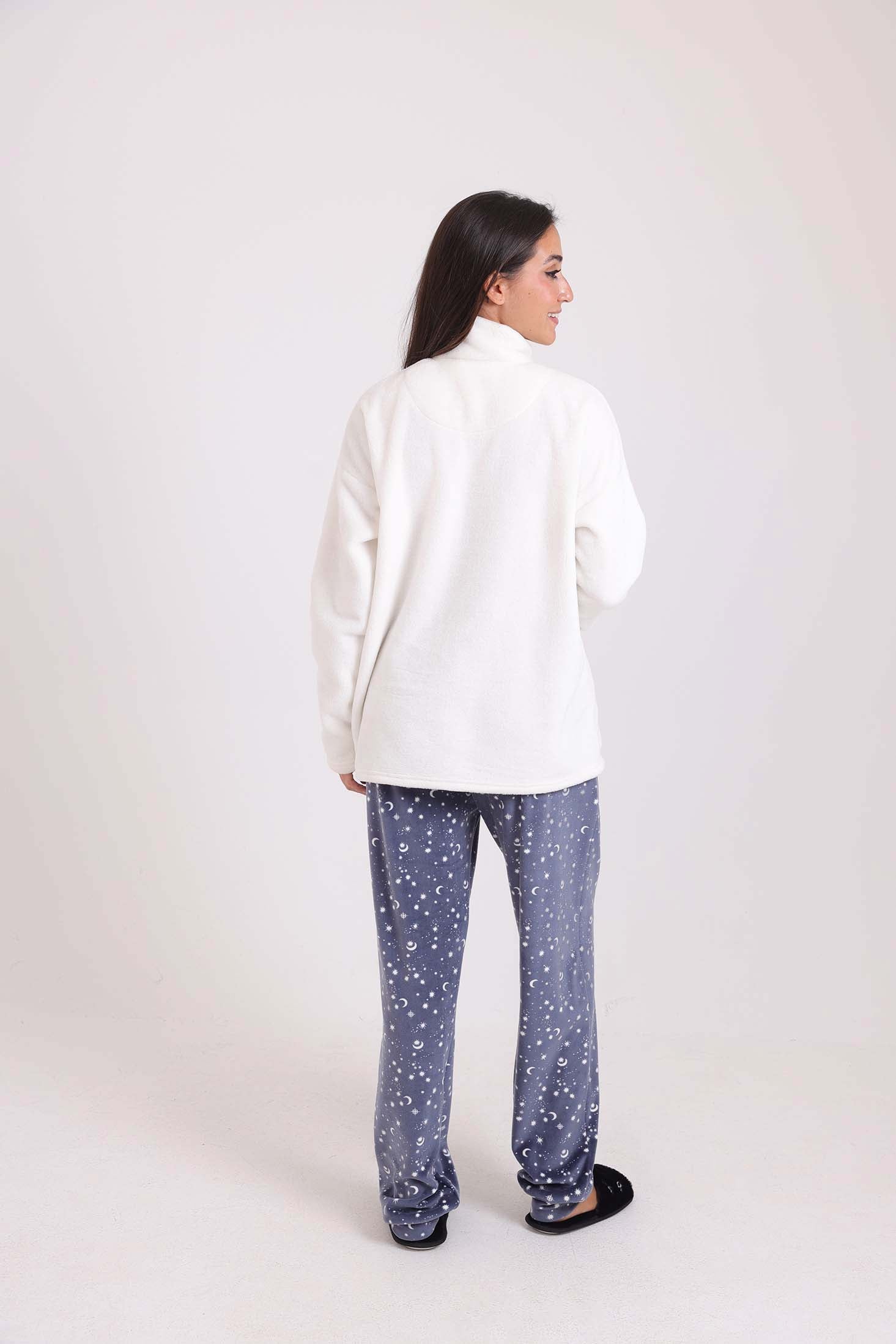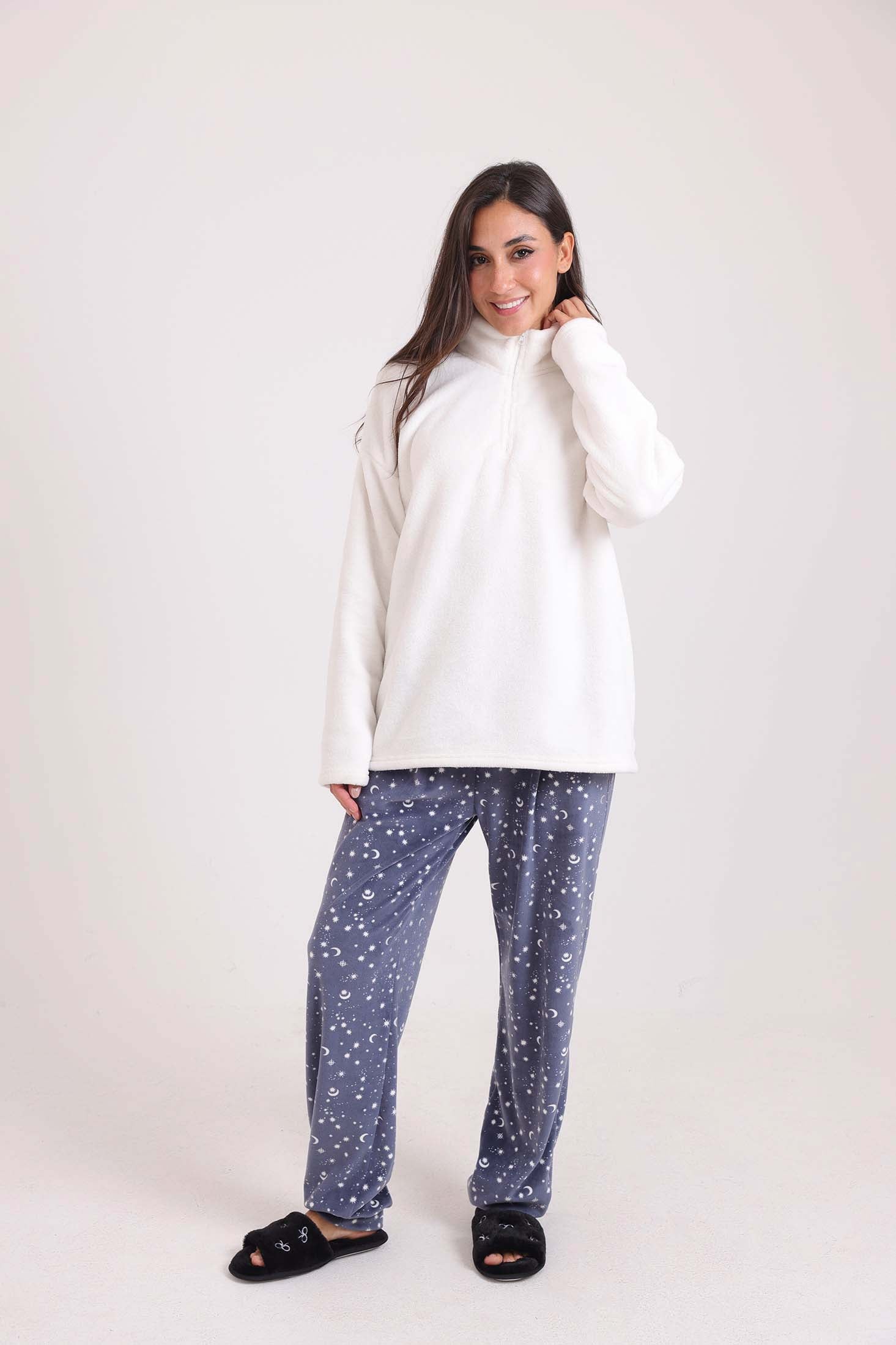 Solid Fleece Sweatshirt & Patterned Pants Pajama Set